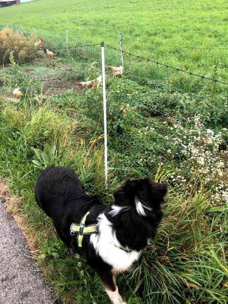Kymba pensa che i polli siano fantastici, ma non li inseguirebbe mai, perché è un buon cane.